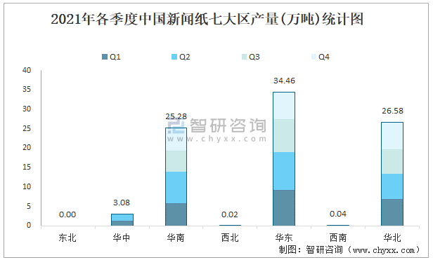 2021年各季度中國新聞紙七大區產量統計圖