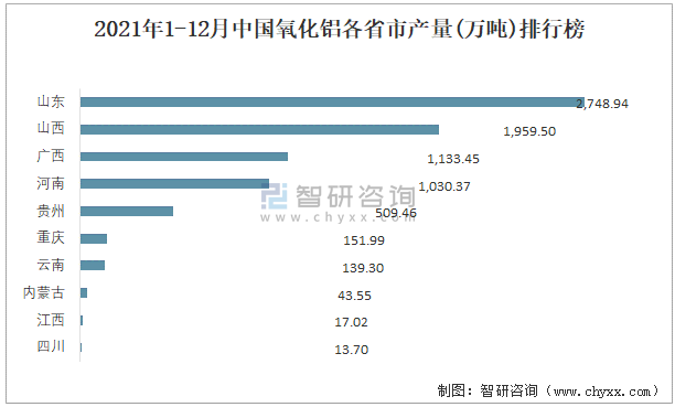 2021年1-12月中國氧化鋁各省市產量排行榜