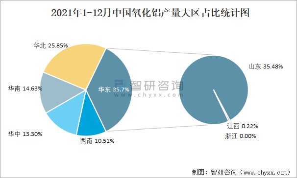 2021年1-12月中國氧化鋁產量大區占比統計圖