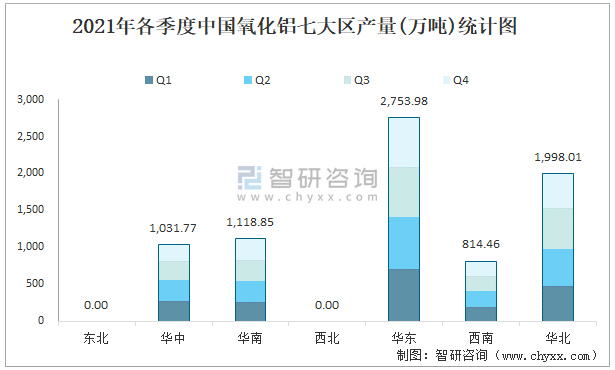 根據國家統計局數據顯示:2021年各季度中國氧化鋁主要集中在華東、華北、華南地區生產;2021年1-12月中國氧化鋁產量大區分布不均衡,其中華東地區產量最高,特別是山東省貢獻了華東地區絕大部分的產量;2021年1-12月中國氧化鋁各省市產量呈現梯隊式分布,山東、山西、廣西等省產量最多。