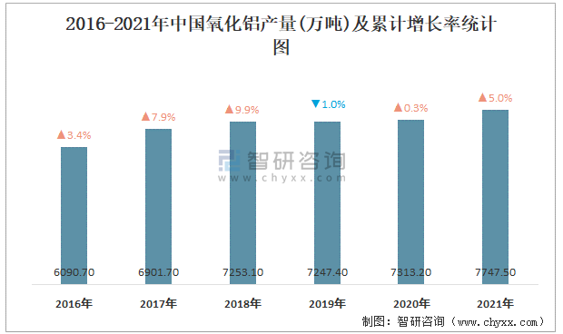 2016-2021年中國氧化鋁產量及累計增長率統計圖