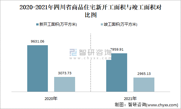 2020-2021年四川省商品住宅新開工面積與竣工面積對比圖