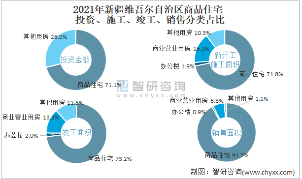 根據國家統計局數據統計可知:2021年新疆維吾爾自治區房地產開發企業在商品住宅中投資金額占比為71.1%(注:只有投資金額中其他用房包含辦公樓、商業營業用房),商品住宅的新開工面積與竣工面積所占比重差異不大,從銷售面積來看,商品住宅為銷售主力(占比高達91.7%),辦公樓銷售面積占比少于商業營業用房銷售面積占比。