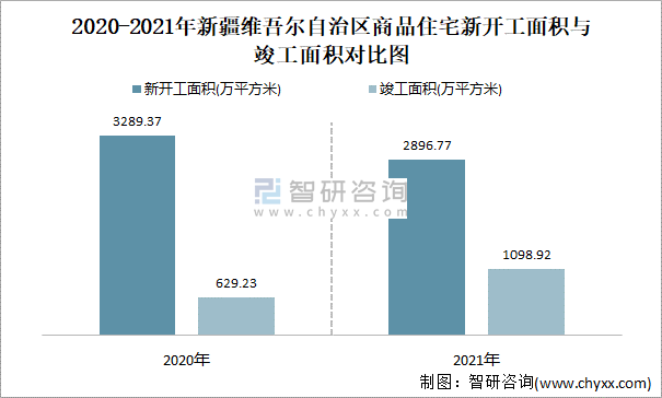 2020-2021年新疆維吾爾自治區商品住宅新開工面積與竣工面積對比圖