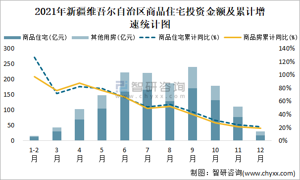 根據國家統計局數據統計可知:2021年12月新疆維吾爾自治區房地產開發投資商品房投資金額為30億元(其中商品住宅為18.38億元,辦公樓、商業營業用房等其他用房11.62億元);2021年新疆維吾爾自治區房地產開發投資商品住宅累計投資金額為1067.67億元,投資金額累計同比增長21.5%。