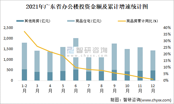2021年廣東省辦公樓投資金額及累計增速統計圖