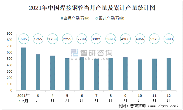 2021年中國焊接鋼管當月產量及累計產量統計圖