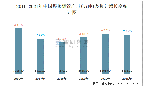 2016-2021年中國焊接鋼管產量及累計增長率統計圖