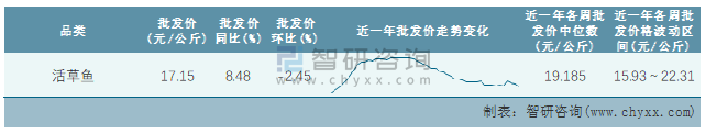 根據農村農業部數據統計可知:2022年第8周全國活草魚平均批發價為17.15元/公斤,同比增加8.48%,環比下跌2.45%,近一年全國活草魚平均批發價最高達到22.31元/公斤,批發價最低也要15.93元/公斤。