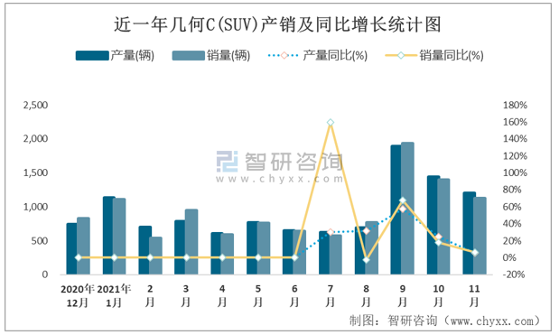 近一年幾何C(SUV)產(chǎn)銷及同比增長統(tǒng)計(jì)圖