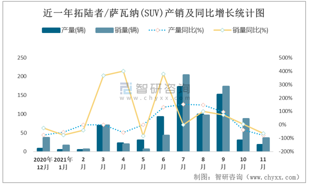 2021年11月拓陸者/薩瓦納(SUV)產銷量分別為18輛和36輛 當月產銷率為200%