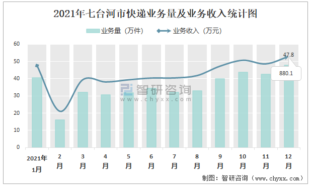 2021年七臺河市快遞業務量及業務收入統計圖