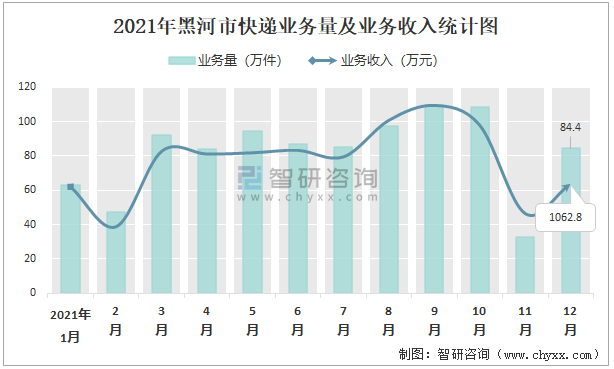 2021年12月黑河市快遞業務量與業務收入分別為84.40萬件和1062.8萬元