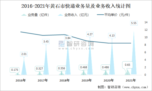 2016-2021年黃石市快遞業(yè)務(wù)量及業(yè)務(wù)收入統(tǒng)計(jì)圖