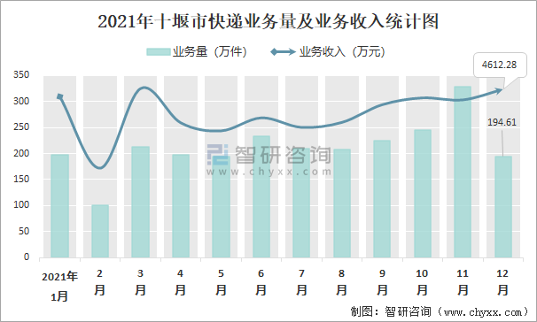 2021年十堰市快遞業(yè)務(wù)量及業(yè)務(wù)收入統(tǒng)計(jì)圖