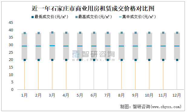 根據國信房地產信息網數據可知:近一年石家莊市商業用房租賃集中成交價在29元/㎡-29.25元/㎡之間波動,12月集中成交價為29.1元/㎡;寫字樓租賃集中成交價2021年3月達到最高值(29.4元/㎡)。