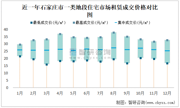 近一年石家莊市一類地段住宅市場租賃成交價格對比圖