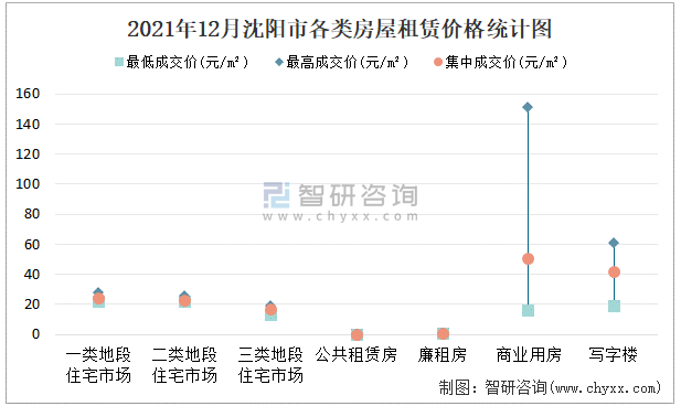 根據國信房地產信息網數據可知:2021年12月沈陽市7類房屋中,公共租賃房無統計數據,廉租房租賃集中成交價為0.5元/㎡;商業用房租賃最高成交價、集中成交價均高于其他類房屋價格,一類地段住宅市場租賃最低成交價最高,為22元/㎡;三類地段住宅市場租賃集中成交價約為17元/㎡。