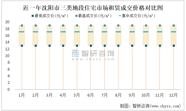 根據國信房地產信息網數據可知:近一年沈陽市一類地段住宅市場租賃成交價格有一定幅度波動,12月最高成交價與最低成交價差距為6元/㎡;近一年沈陽市二類地段住宅市場租賃最低成交價與最高成交價的差距穩定在4元/㎡;近一年三類地段住宅市場租賃成交價在13元/㎡-19元/㎡之間波動。