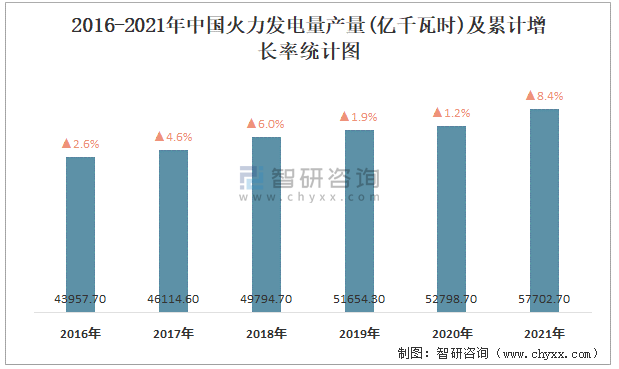 2016-2021年中國火力發(fā)電量產(chǎn)量及累計增長率統(tǒng)計圖