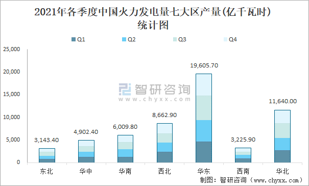 2021年各季度中國火力發(fā)電量七大區(qū)產(chǎn)量統(tǒng)計圖