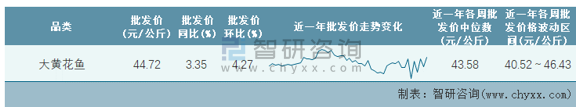 根據農村農業部數據統計可知:2022年第9周全國大黃花魚平均批發價為44.72元/公斤,同比增加3.35%,環比增加4.27%,近一年全國大黃花魚平均批發價最高達到46.43元/公斤,批發價最低也要40.52元/公斤。
