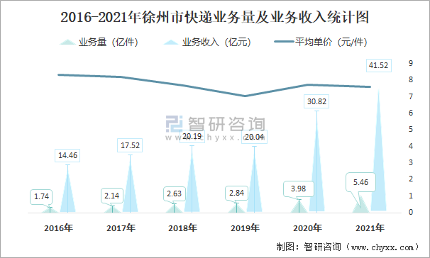 2016-2021年徐州市快遞業務量及業務收入統計圖