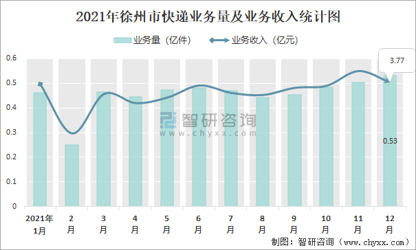 2021年12月徐州市快遞業務量與業務收入分別為5344.5萬件和37673.9萬元