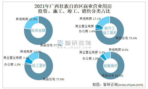 根據國家統計局數據統計可知:2021年廣西壯族自治區房地產開發企業在包括商業營業用房在內的其他用房投資金額占比為22.3%(注:只有投資金額中其他用房包含辦公樓、商業營業用房),商業營業用房的新開工面積與竣工面積所占比重差異不大,從銷售面積來看,商業營業用房銷售面積占比高于辦公樓銷售面積占比。