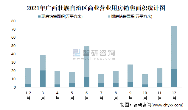 根據國家統計局數據可知:2021年廣西壯族自治區商業營業用房銷售面積為324.54萬平方米(其中銷售現房91.98萬平方米,銷售期房232.56萬平方米),2021年12月廣西壯族自治區商業營業用房銷售面積為74.09萬平方米;2021年廣西壯族自治區商業營業用房期房銷售面積遠高于現房銷售面積。