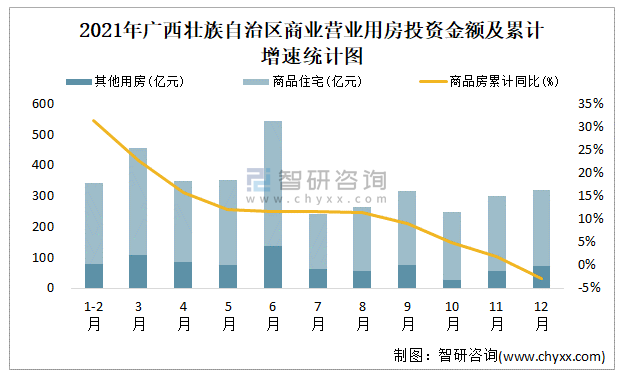根據國家統計局數據統計可知:2021年12月廣西壯族自治區房地產開發投資商品房投資金額為320.76億元,其中包括辦公樓、商業營業用房等其他用房72.54億元(注:辦公樓、商業營業用房未分開統計);2021年廣西壯族自治區房地產開發投資包括商業營業用房在內的其他用房累計金額為831.04億元。
