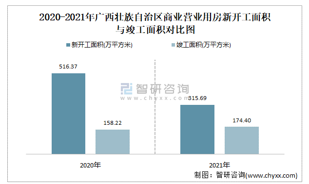 2020-2021年廣西壯族自治區商業營業用房新開工面積與竣工面積對比圖