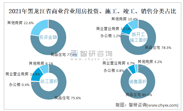 根據國家統計局數據統計可知:2021年黑龍江省房地產開發企業在包括商業營業用房在內的其他用房投資金額占比為22.6%(注:只有投資金額中其他用房包含辦公樓、商業營業用房),商業營業用房的新開工面積與竣工面積所占比重差異不大,從銷售面積來看,商業營業用房銷售面積占比高于辦公樓銷售面積占比。