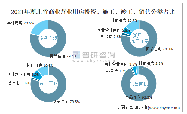 根據國家統計局數據統計可知:2021年湖北省房地產開發企業在包括商業營業用房在內的其他用房投資金額占比為20.6%(注:只有投資金額中其他用房包含辦公樓、商業營業用房),商業營業用房的新開工面積與竣工面積所占比重差異不大,從銷售面積來看,商業營業用房銷售面積占比高于辦公樓銷售面積占比。