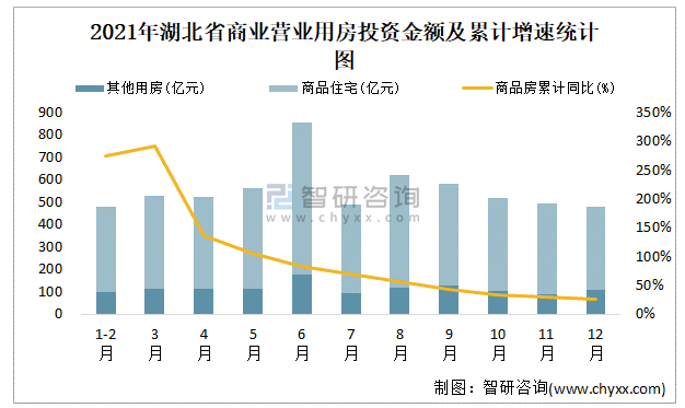 根據國家統計局數據統計可知:2021年12月湖北省房地產開發投資商品房投資金額為477.84億元,其中包括辦公樓、商業營業用房等其他用房110.22億元(注:辦公樓、商業營業用房未分開統計);2021年湖北省房地產開發投資包括商業營業用房在內的其他用房累計金額為1262.63億元。