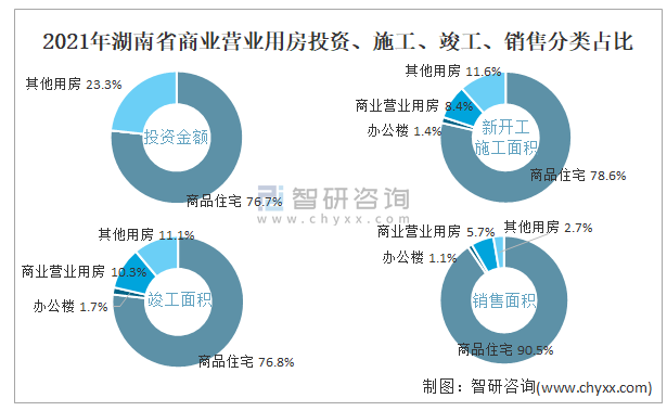 根據國家統計局數據統計可知:2021年湖南省房地產開發企業在包括商業營業用房在內的其他用房投資金額占比為23.3%(注:只有投資金額中其他用房包含辦公樓、商業營業用房),商業營業用房的新開工面積與竣工面積所占比重差異不大,從銷售面積來看,商業營業用房銷售面積占比高于辦公樓銷售面積占比。