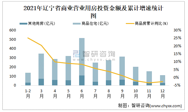 根據國家統計局數據統計可知:2021年12月遼寧省房地產開發投資商品房投資金額為111.11億元,其中包括辦公樓、商業營業用房等其他用房25.1億元(注:辦公樓、商業營業用房未分開統計);2021年遼寧省房地產開發投資包括商業營業用房在內的其他用房累計金額為579.72億元。
