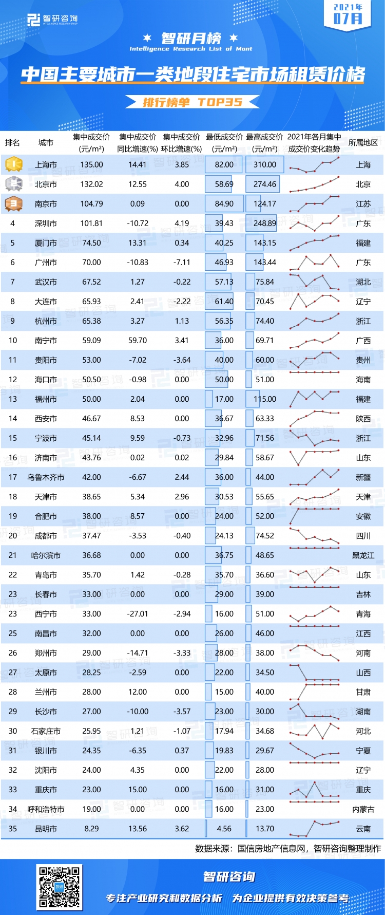 為研究中國城市房屋各地段住宅、商業用房、寫字樓每平米租賃的相關價格,智研咨詢數據中心以不同類型房屋集中成交價為依據進行排序,推出《智研月榜:2021年7月中國主要城市一類地段住宅市場租賃價格排行榜單TOP35》,以供參考。