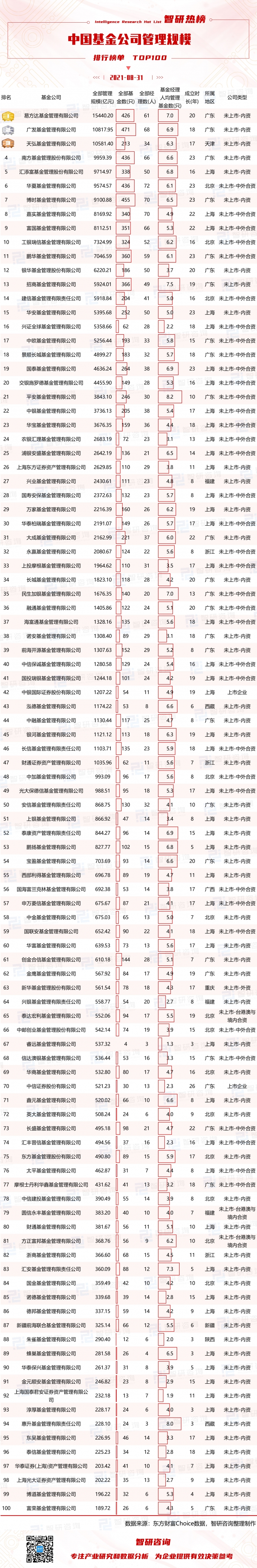 為研究在中國注冊成立的基金公司管理規模及對應基金情況,智研咨詢數據中心推出《智研熱榜:2021年中國基金公司管理規模排行榜單TOP100》,以供參考。