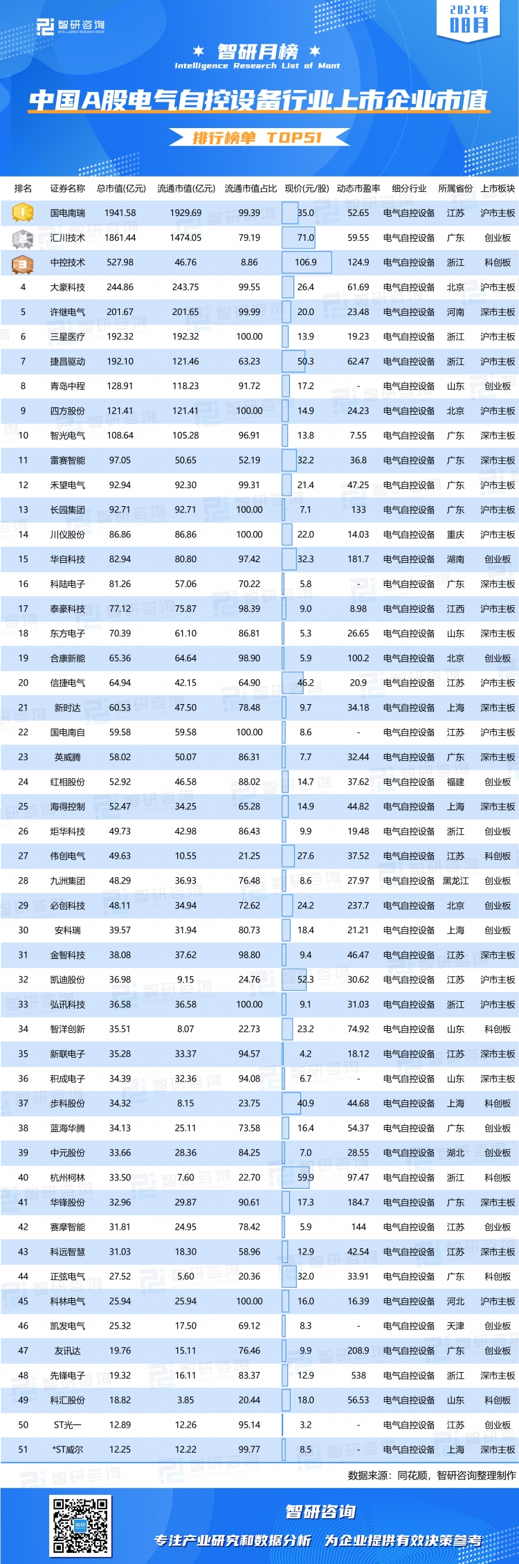 為研究中國電氣自控設備行業上市企業股票市值,智研咨詢數據中心推出《智研月榜:2021年8月中國A股電氣自控設備行業上市企業市值排行榜單TOP51》,以供參考。