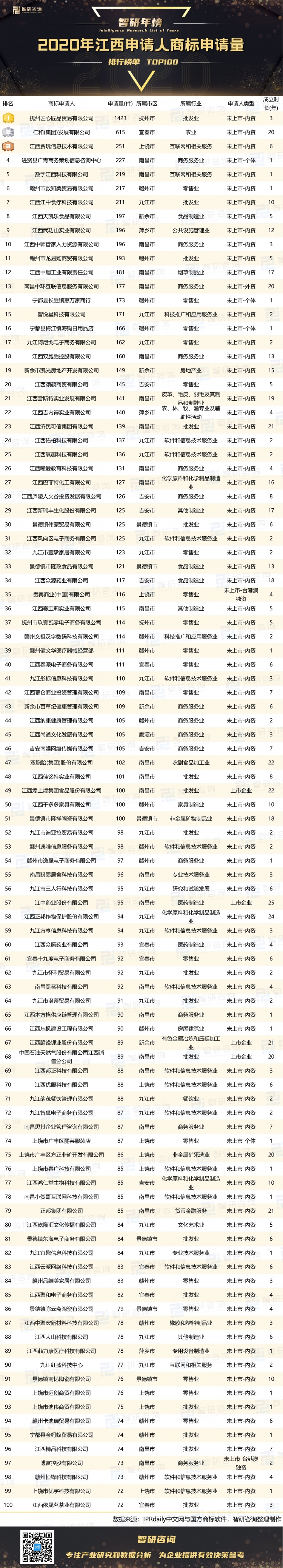 依據榜單可知:1)撫州匠心匠品貿易有限公司商標申請量超過1千,位居榜首,49個申請人商標申請量低于100個;2)撫州市只有2家企業上榜,商標申請總數為1537個,其商標申請數高于上饒市、宜春市、吉安市、景德鎮市、新余市、萍鄉市、鷹潭市地區商標申請數;3)100個申請人分布在29個行業,零售業、批發業、軟件和信息技術服務業、商務服務業4個行業的公司數均超過10個,批發業的商標申請數最大,達到3123,農業只有1家企業上榜,為仁和(集團)發展有限公司,商標申請量是615個,排名第二;4)商標申請人以未上市內資企業為多,89家企業商標申請量為11842個,貴賓商業(中國)有限公司、博富控股有限公司這2家未上市臺港澳獨資企業商標申請量為189個,南昌中環互聯信息服務有限公司作為唯一一家未上市外資企業上榜,商標申請量為177,排名top13;5)成立了25年的江中藥業股份有限公司商標申請量為95,排名第57,進賢縣廣青商務策劃信息咨詢中心、數字江西科技有限公司、贛州市數知美貿易有限公司成立時長均只有1年左右,商標申請量排名top4、top5、top6。