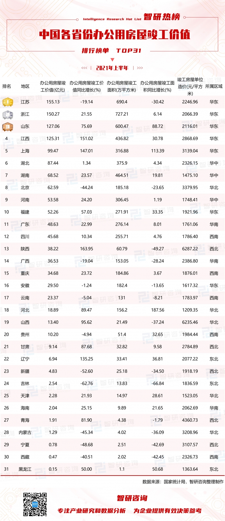 依據(jù)榜單可知,江蘇以155.13億元的辦公用房竣工價(jià)值排名第一,同比下降了19.14%,浙江緊隨其后,辦公用房竣工價(jià)值高達(dá)150.27億元,同比增長(zhǎng)了21.55%;從辦公用房屋竣工價(jià)值的同比增長(zhǎng)來看,全國(guó)各省市主要呈增長(zhǎng)趨勢(shì),有20個(gè)省市呈現(xiàn)不同程度的增長(zhǎng),陜西辦公用房屋竣工價(jià)值同比增長(zhǎng)最大(163.95%),其次是江西的辦公用房屋竣工價(jià)值同比增長(zhǎng)了151.02%,排名第4。