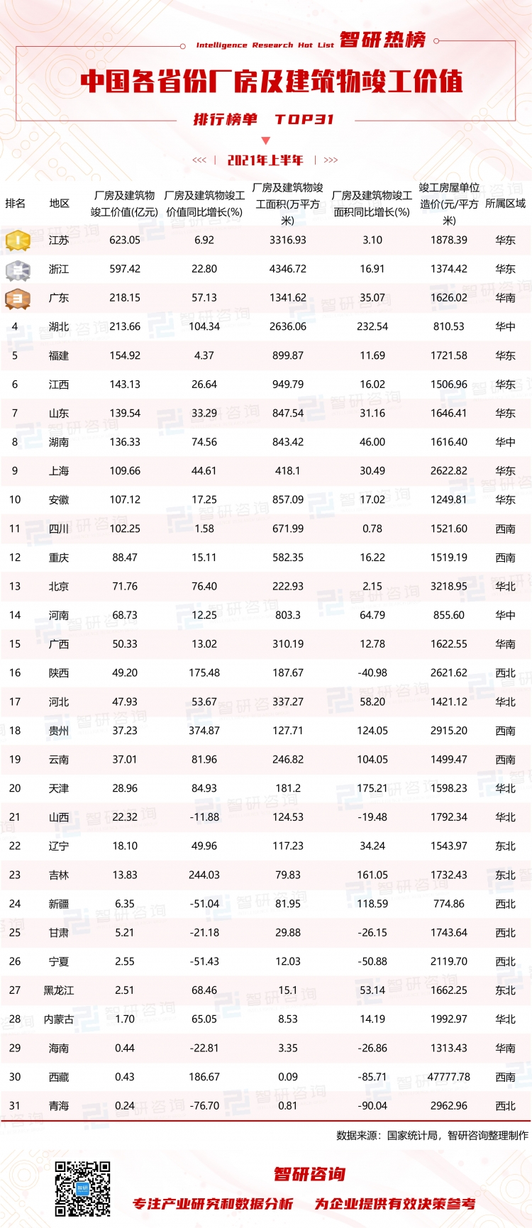 依據榜單可知,江蘇以623.05億元的廠房及建筑物竣工價值排名第一,同比增長了6.92%,浙江緊隨其后,廠房及建筑物竣工價值為597.42億元,同比增長了22.80%,占總竣工價值的20.11%;從廠房及建筑物竣工價值同比來看,25個省市的廠房及建筑物竣工價值同比有不同程度的增長,且榜單前20個省市的同比均呈現增長趨勢的,貴州同比增長最大(374.87%),排名第18位,其次是吉林同比增長244.03%,排名第23位。