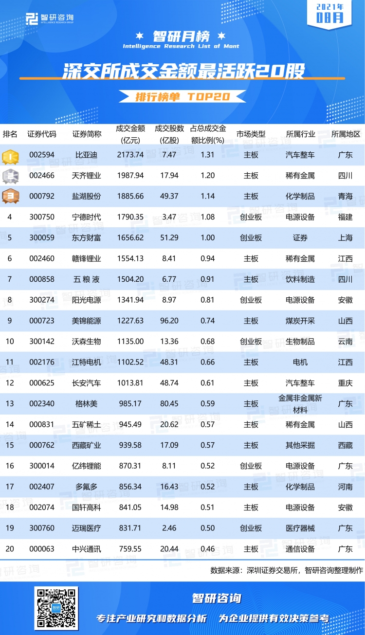 依據榜單可知:1)12家企業成交金額超過1000億元,其中比亞迪以2173.74億元的成交金額排名第一,占深交所總成交金額的1.31%,排名第2的天齊鋰業成交金額為1987.94億元,占深交所總成交金額的1.2%;2)從成交股數來看,13家企業成交股數超過10億股,其余7家企業成交股數均不足10億股,美錦能源成交股數最高(96.2億股),占榜單企業總成交股數的17.79%,遠遠超過其他企業,格林美的成交股數也高達80.45億股;3)榜單企業涵蓋了13個行業,其中電源設備有4家企業上榜,稀有金屬有3家企業上榜,汽車整車、化學制品均有2家企業上榜;4)企業所在地主要集中在廣東(5家)、四川(2家)、江西(2家),安徽(2家);20家企業有14家在主板上市,6家企業在創業板上市,其中榜單前3家企業均在主板上市。