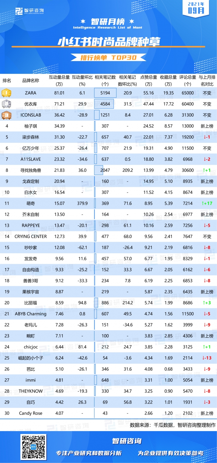 依據(jù)榜單可知:1)ZARA以81.01萬的互動量居于榜首,且收獲了最多的點贊總量、收藏總量和評論總量,排名第二的是優(yōu)衣庫,互動量為71.21萬,top1和top2的互動量遠遠超過其他品牌;2)與上月相比,除去新上榜的品牌,10家品牌互動量有所增長,其中增長幅度最大的是萌奇,增長了379.94%,排名上升了17個位次,吵吵家互動量環(huán)比下降幅度最大;3)9月小紅書時尚品牌中共有4個品牌相關(guān)筆記數(shù)超過1千個,其中尋找獨角獸的相關(guān)筆記數(shù)高于ICONSLAB,但其互動量低于ICONSLAB,有3個品牌相關(guān)筆記數(shù)低于100個;4)與8月相比,除去新上榜的品牌,僅吵吵家、老瑪兒、崛起的小個子這3個品牌相關(guān)筆記數(shù)有所下降,其他品牌相關(guān)筆記數(shù)均呈現(xiàn)不同程度的增長,比麗福的相關(guān)筆記數(shù)增幅最大;5)