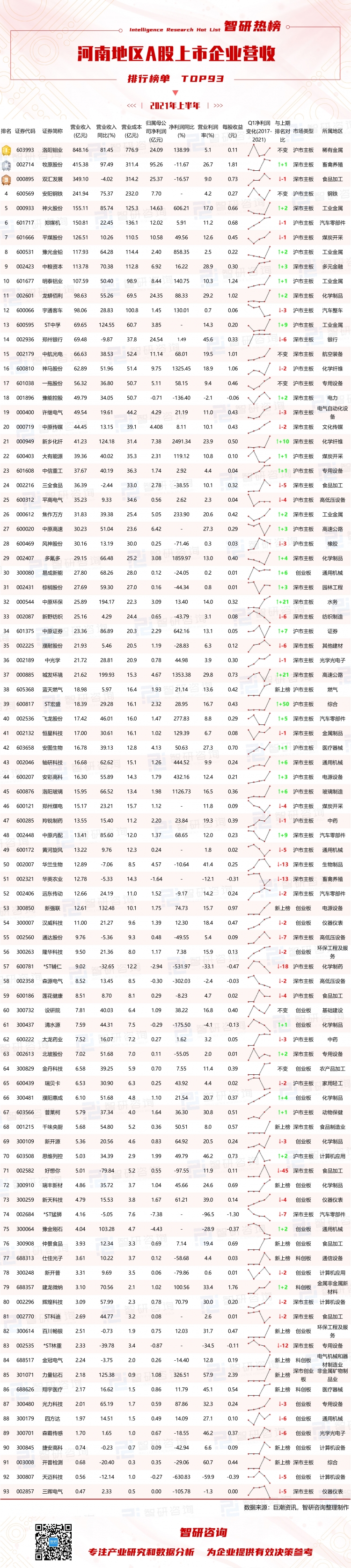 為研究河南地區各行各業A股上市企業披露的營收及相關利潤情況,智研咨詢數據中心推出《智研熱榜:2021年上半年河南地區A股上市企業營收排行榜單TOP93》,以供參考。