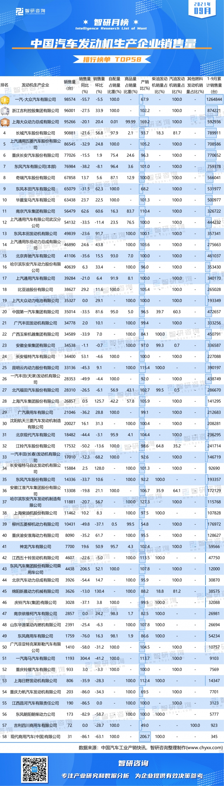 1、9月有4家企業發動機銷量超過9萬臺,2家企業發動機銷量不足100臺
