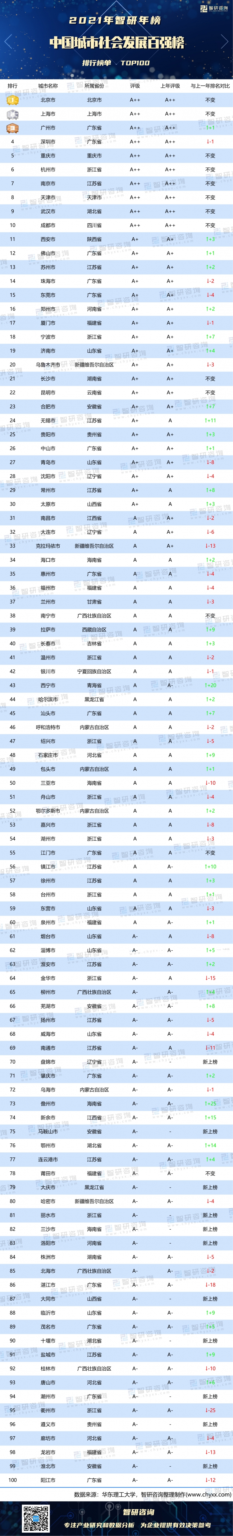 相較于上一年排名,13個城市排名不變,其中包括8個前10強城市;39個城市排名上升,其中海南省儋州市升幅最大,排名提高25個名次升至第73;37個城市排名下滑,其中浙江省衢州市降幅最大,排名下降25個名次跌至第95;11個城市新上榜,其中安徽省有馬鞍山市、淮北市2個城市新上榜。