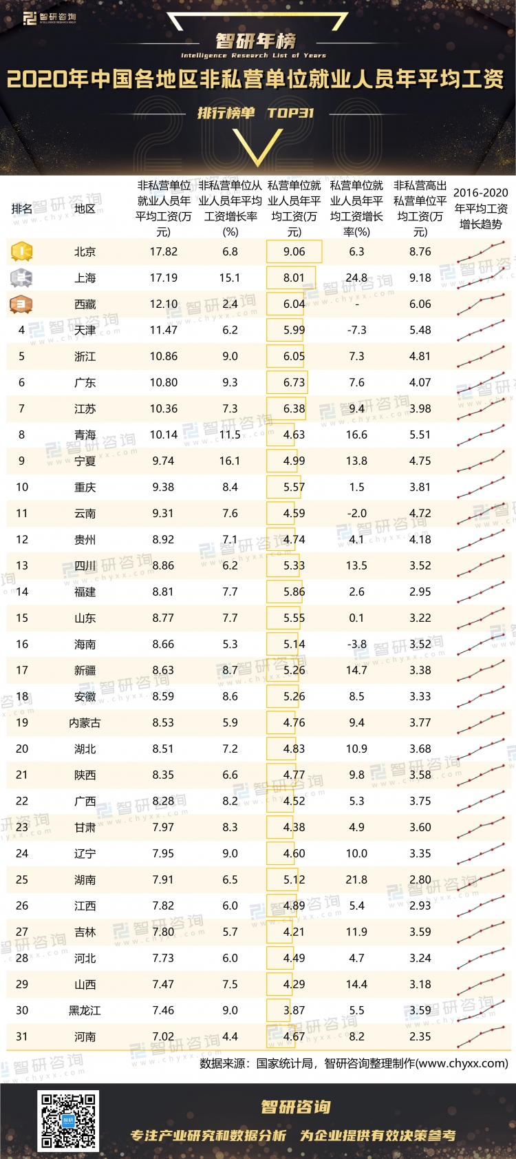8個省份非私營單位就業人員年平均工資超過10萬元,北京、上海依舊領跑全國,西藏非私營單位就業人員約12.10萬元,排名第3,比天津、浙江、廣東、江蘇這些地區的就業人員年平均工資還高,青海以10.14萬元的年平均工資排名第8。