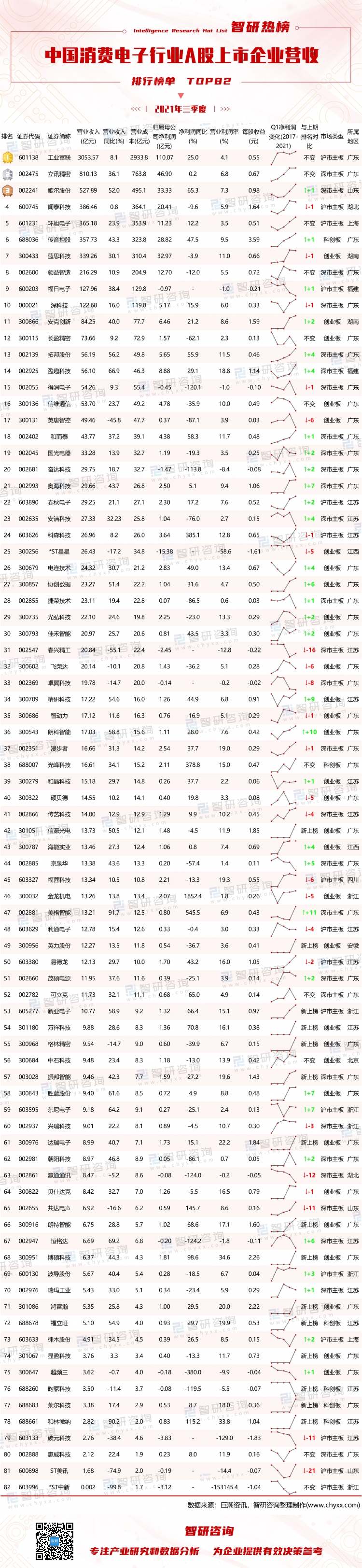 為研究中國各行各業A股上市企業披露的營收及相關利潤情況,智研咨詢數據中心推出《智研熱榜:2021年三季度中國消費電子行業A股上市企業營收排行榜單TOP82》,以供參考。